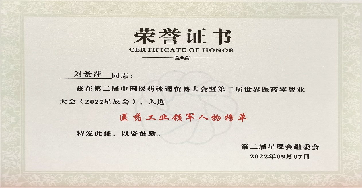 本次星辰会期间,sunbet申搏斩获颇丰,获得多项行业奖项及荣誉。在开幕式上,刘景萍董事长荣获“医药工业领军人物”称号。